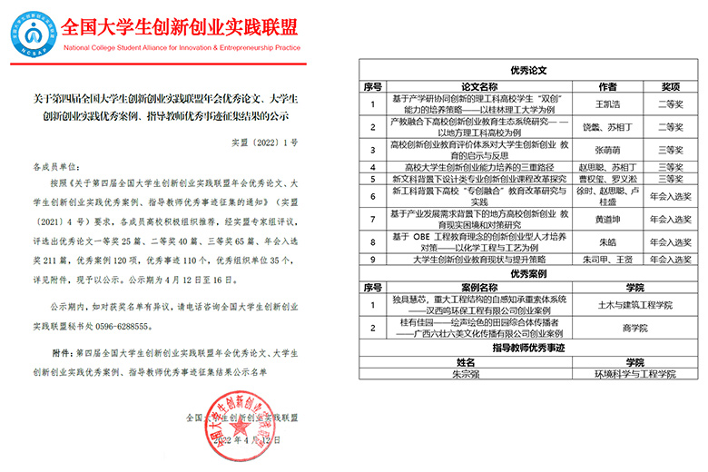 近日,第四届全国大学生创新创业实践联盟年会优秀论文、大学生创新创业实践优秀案例、指导教师优秀事迹征集结果揭晓。Beat365官网获评全国大学生创新创业实践“优秀组织单位”,年会征集论文分别获优秀论文二等奖2篇、三等奖3篇、入选奖4篇,土木与建筑工程学院和商学院2个创新创业项目获评“优秀案例”,环境科学与工程学院朱宗强研究员获评“指导教师优秀事迹”等多项表彰。