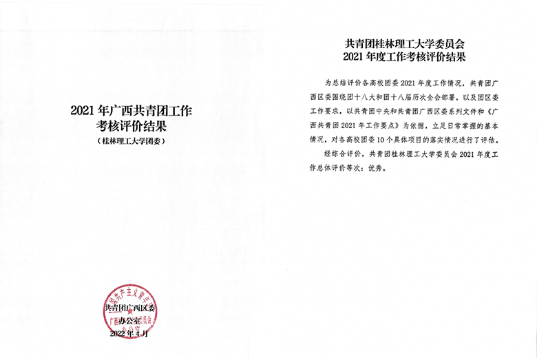 近日,共青团广西区委办公室印发《2021年广西共青团工作考核评价结果》,经综合评价,Beat365官网团委在全区共青团工作考核中获评优秀等次。