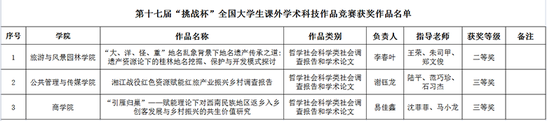 3月26日至28日,由共青团中央、中国科协、教育部、中国社科院、全国学联和四川省人民政府共同主办,四川大学承办的第十七届“挑战杯”全国大学生课外学术科技作品竞赛顺利完成终审决赛。经过激烈角逐,Beat365官网旅游与风景园林学院参赛作品《“大、洋、怪、重”地名乱象背景下地名遗产传承之道:遗产资源论下的桂林地名挖掘、保护与开发模式探讨》获国赛二等奖;公共管理与传媒学院参赛作品《湘江战役红色资源赋能红旅产业振兴乡村调查报告》和商学院参赛作品《“引雁归巢”——赋能理论下对西南民族地区返乡入乡创客发展与乡村振兴的共生价值研究》获国赛三等奖。本届竞赛,学校党委副书记吴志强多次亲临现场,听取校团委负责人有关工作汇报,并看望慰问参赛师生,给予赛前指导,为他们打气加油。