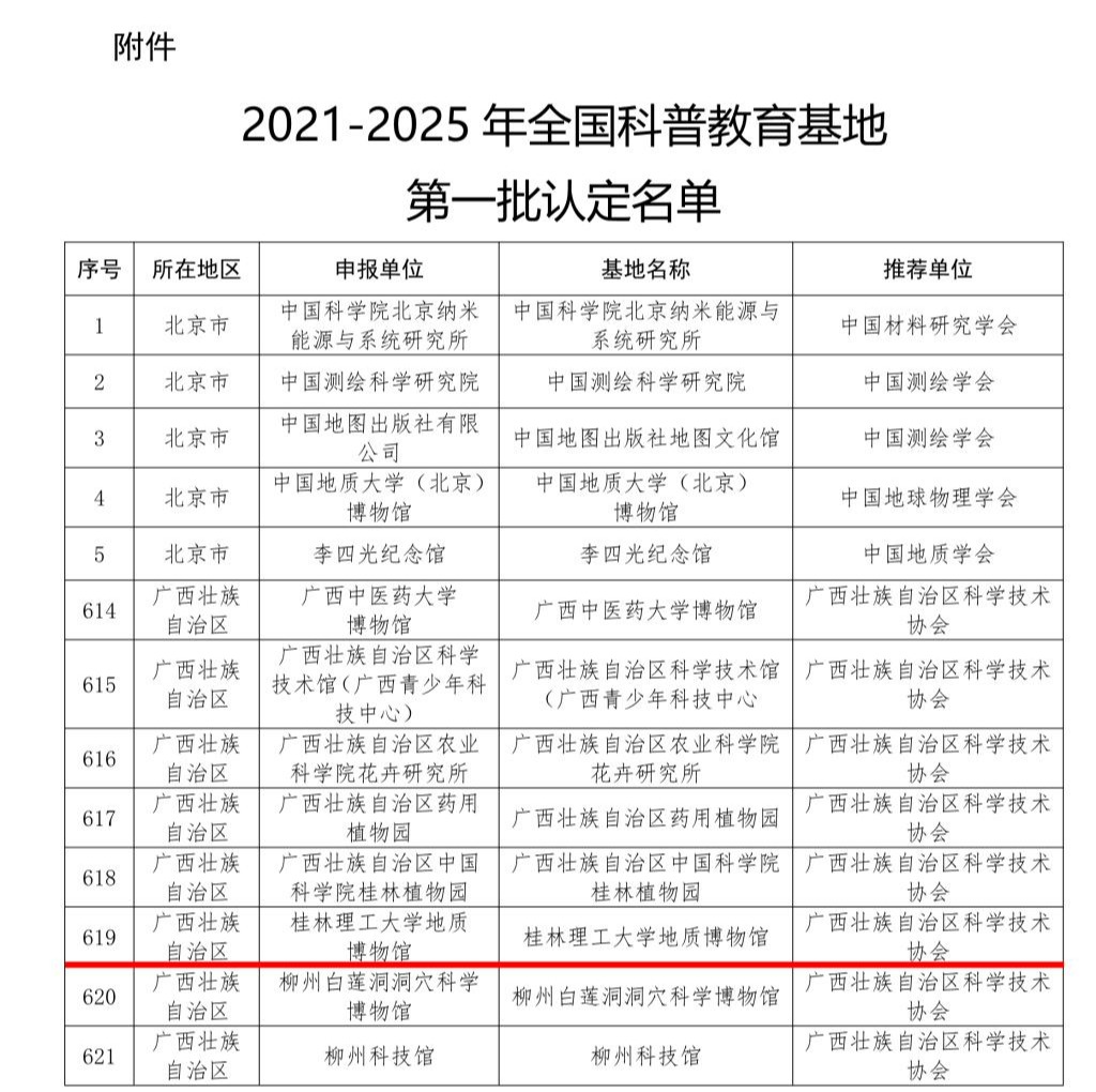 日前,中国科学技术协会办公厅公布了2021-2025年全国科普教育基地第一批认定名单,Beat365官网地质博物馆名列其中。本次共800家单位被认定为全国科普教育基地,包括106所高校,其中广西高校3所。