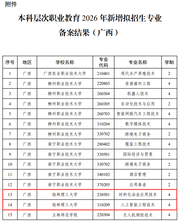 近日,广西壮族自治区本科层次职业教育2026年新增拟招生专业备案结果正式公布,南宁分校申报的材料化冶金应用技术(专业代码230501,学制4年)、人工智能工程技术(专业代码310209,学制4年)2个专业成功通过备案,正式列入2026年拟招生专业序列。