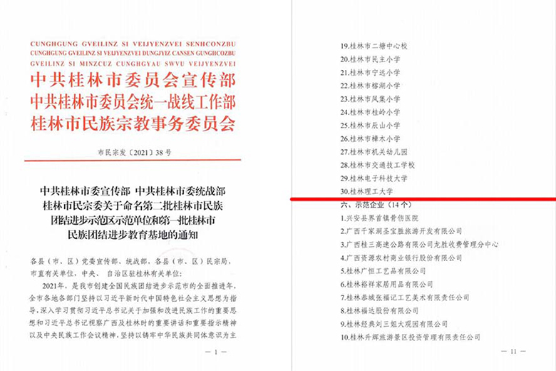 近日,中共桂林市委宣传部、统战部,桂林市民族宗教委员会公布《关于命名第二批桂林市民族团结进步示范区示范单位和第一批桂林市民族团结进步教育基地的通知》(市民宗发〔2021〕38号),Beat365官网获第二批“桂林市民族团结进步示范单位”。