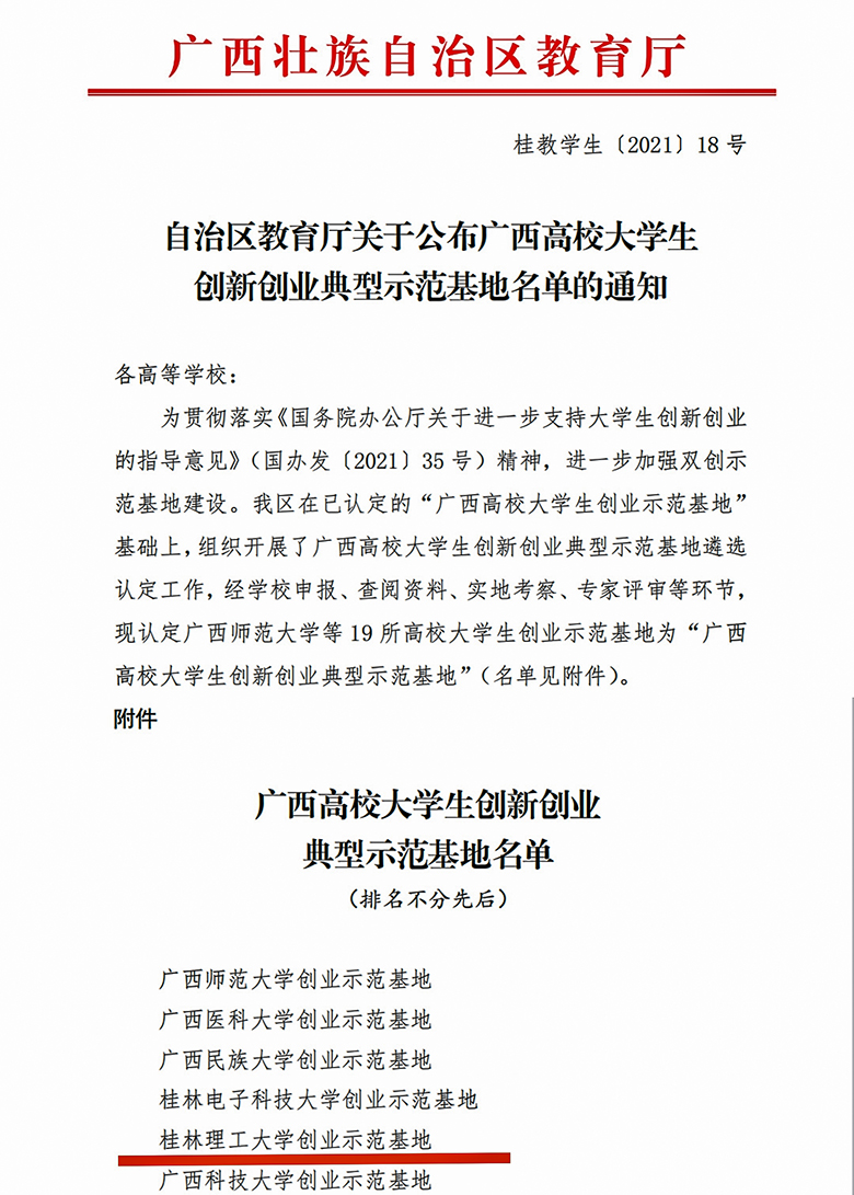 为贯彻落实《国务院办公厅关于进一步支持大学生创新创业的指导意见》(国办发〔2021〕35 号)精神,进一步加强双创示范基地建设,近日,自治区教育厅在已认定的“广西高校大学生创业示范基地”基础上,组织开展了广西高校“大学生创新创业典型示范基地”遴选认定工作。经学校申报和自治区教育厅查阅资料、实地考察、专家评审等环节,Beat365官网大学生创业示范基地被认定为“广西高校大学生创新创业典型示范基地”。