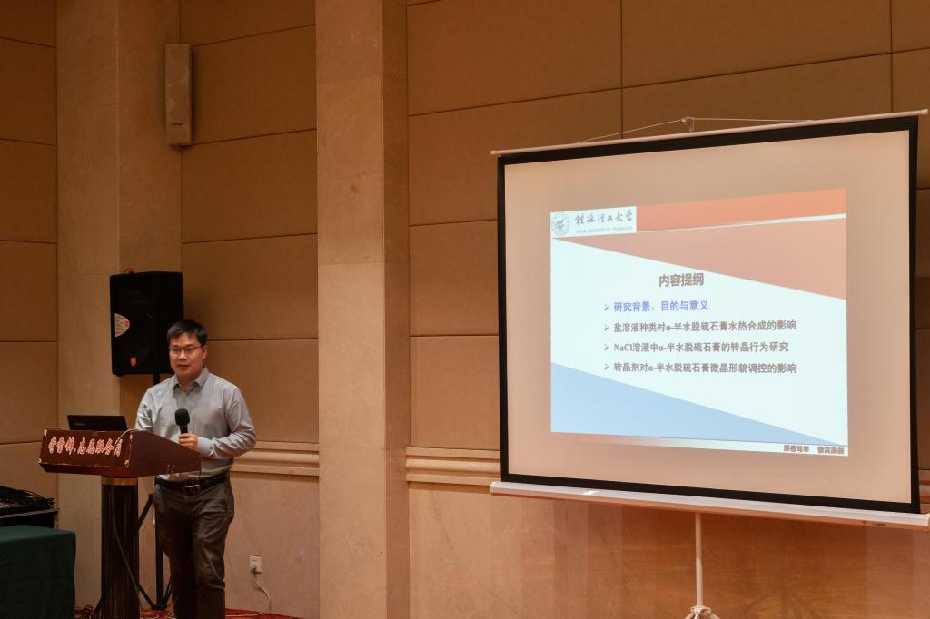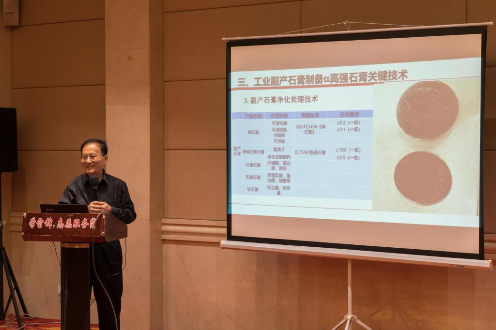 会上,陈平教授作了题为“冶金固废制备优质胶凝材料关键技术研究与工程应用”的报告,分析了冶金渣固废的现状和发展趋势,分享了冶金固废制备高抗蚀胶凝材料与应用、工业固废制备超细高活性矿物掺合料、钢渣-赤泥协同制备安全环保道路材料等技术成果;段鹏选教授作了题为“‘双碳’背景下高强石膏的发展机遇及其应用技术”的报告,从“碳达峰、碳中和”背景展开,分析了建材行业尤其是石膏行业与碳排放的关系、工业副产石膏资源化利用现状,指出了α高强石膏的优点、应用和发展趋势,分享了α高强石膏制备工艺及装备,提出了α高强石膏关键技术应着眼于工业副产石膏净化处理、原料预处理、蒸压微晶法和晶体生长控制技术上;胡成副研究员作了题为“α-半水脱硫石膏微晶的水热合成及形貌调控研究”的报告,分享了盐溶液种类对α-半水脱硫石膏水热合成的影响、NaCl溶液中α-半水脱硫石膏的转晶行为研究以及转晶剂对α-半水脱硫石膏微晶形貌调控的影响,深入分析了各影响因素及作用机理,提出了常压水热合成α-半水石膏的优点和展望。