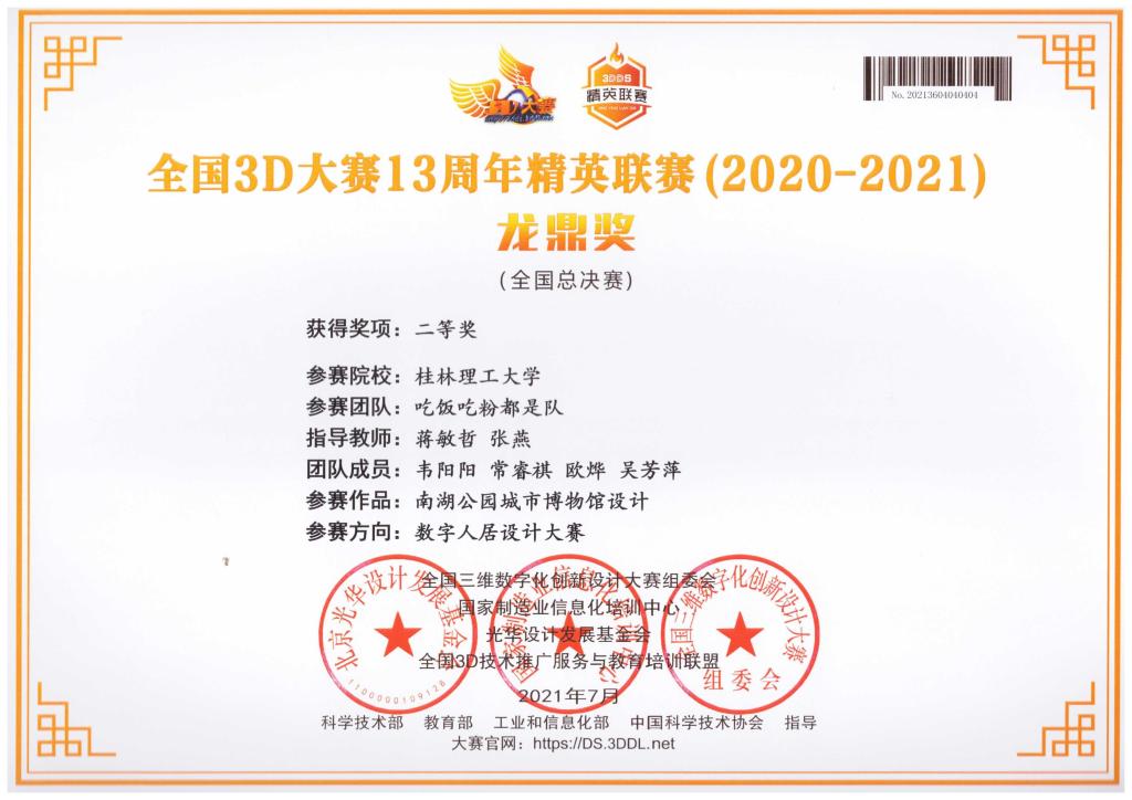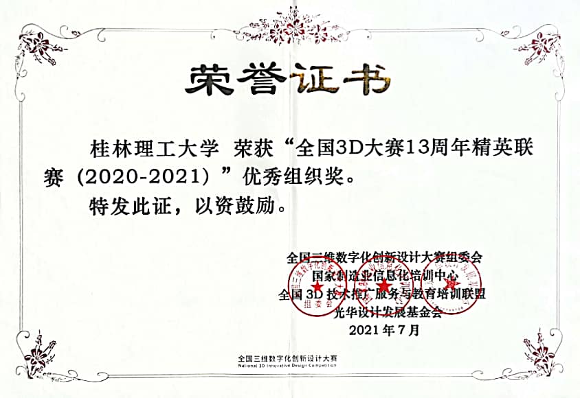 近日,2021全国3D大赛13周年精英联赛全国总决赛落下帷幕, 结合当前疫情防控形势,总决赛采用了线上为主的方式进行。本次大赛共有来自全国389所高校的5556支队伍参赛,Beat365官网以机械与控制工程学院师生为主的代表队喜获全国一等奖1项、二等奖2项、三等奖5项,广西赛区特等奖8项、一等奖9项、二等奖19项、三等奖8项。同时,Beat365官网荣获全国3D大赛13周年精英联赛优秀组织奖。