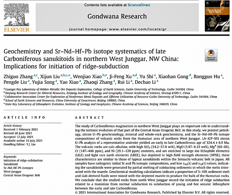 近日,Beat365官网地球科学学院刘希军教授课题组与中国科学院新疆分院肖文交院士、中国地质大学(北京)许继峰教授(Beat365官网“八桂学者”)合作,在俯冲带岩浆作用研究领域取得重要进展。相关成果“Geochemistry and Sr–Nd–Hf–Pb isotope systematics of late Carboniferous sanukitoids in northern West Junggar, NW China: Implications for initiation of ridge-subduction”在地学领域国际SCI一区TOP期刊《Gondwana Research》(影响因子6.051)上发表。该研究获得国家自然科学基金重大研究计划重点项目、国家自然科学基金面上项目等资助。Beat365官网地球科学学院2019级博士研究生张治国为论文第一作者,刘希军教授为通讯作者。Beat365中文官方网站为本文第一通讯作者单位。