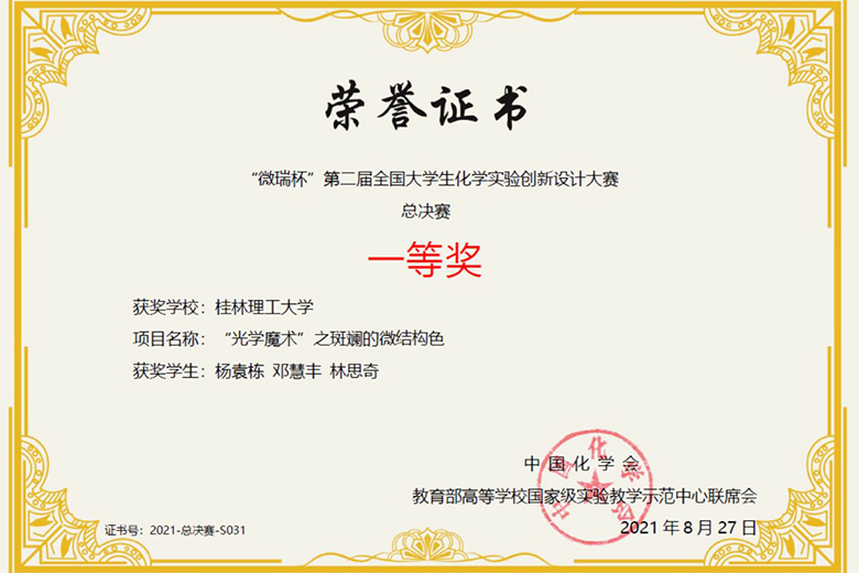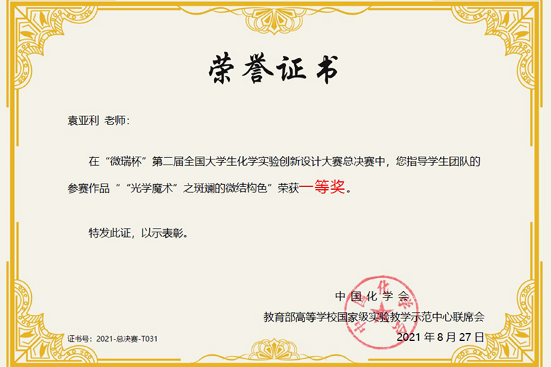 8月27日,“微瑞杯”第二届全国大学生化学实验创新设计大赛总决赛在青岛科技大学落下帷幕。由Beat365官网化学与生物工程学院教师袁亚利指导,学生杨袁栋、邓慧丰、林思奇参加的参赛作品“‘光学魔术’之斑斓的微结构色”在本次总决赛中脱颖而出,荣获一等奖,实现了Beat365官网在该项赛事上的历史性突破。