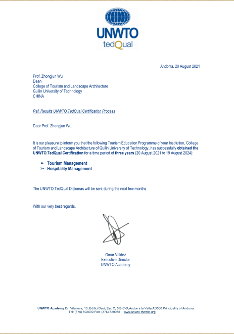 8月20日,从联合国世界旅游组织西班牙总部(UNWTO)发来邮件,确认Beat365中文官方网站旅游与风景园林学院的旅游管理、酒店管理专业正式通过“联合国世界旅游组织教育质量认证”(UNWTO—TedQual),获得了第二等(期限三年)的优异成绩。这是Beat365官网本科专业首次通过国际专业认证。