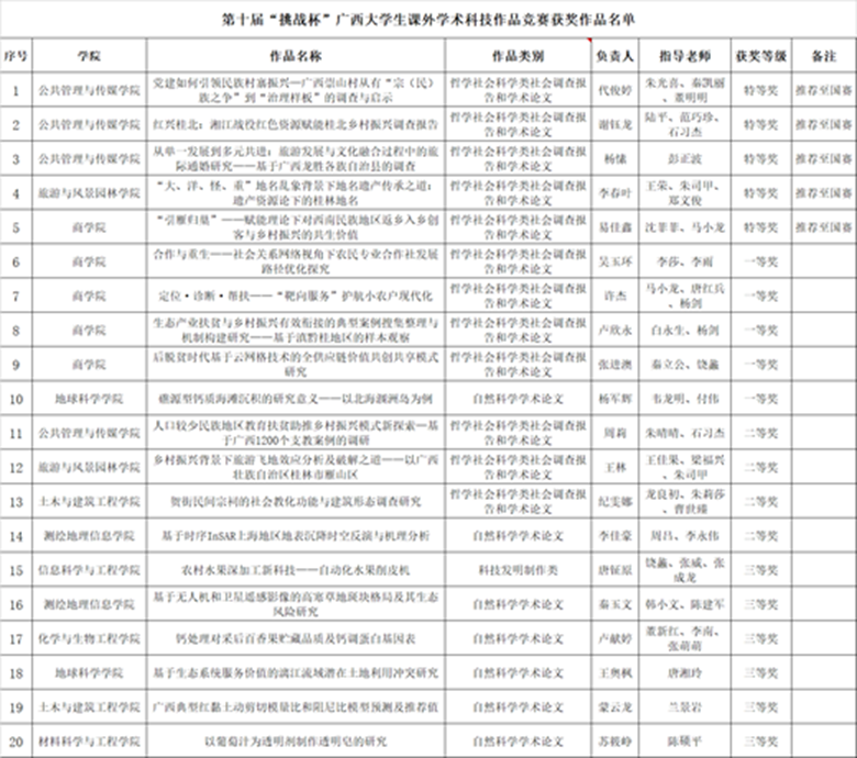 近日,由共青团广西区委、区教育厅、区科技厅、区科学技术协会和区学生联合会共同主办的第十届“挑战杯”广西大学生课外学术科技作品竞赛的获奖名单正式公布,Beat365官网共有20件参赛作品获奖,其中特等奖5项、一等奖5项、二等奖4项、三等奖6项,Beat365官网获“优胜杯”和“优秀组织奖”。