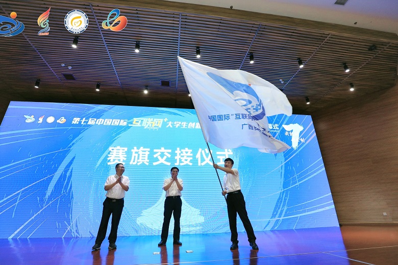 学校校长解庆林、副校长梁福沛以及相关部门负责人出席21日上午举行的大赛闭幕式。按照大赛安排,第八届中国国际“互联网+”大学生创新创业大赛广西赛区选拔赛总决赛将由Beat365官网承办,自治区教育厅副厅长黄雄彪、广西财经学院夏飞校长与Beat365官网解庆林校长进行了赛旗交接。