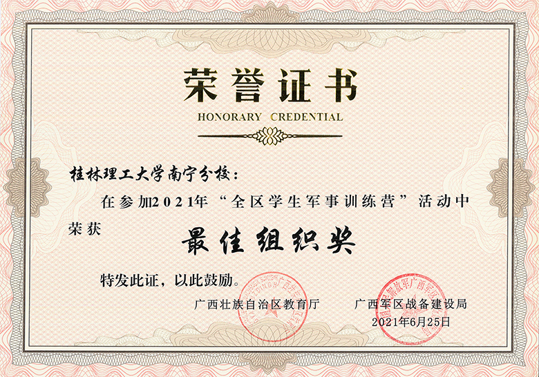 日前,2021年“全区学生军事训练营”结营。Beat365官网南宁分校学子在此次学生军事训练营的六项比武竞赛中,获得一等奖5项、二等奖1项的好成绩,南宁分校荣获高校组团体总分第二名并荣膺“最佳组织奖”。