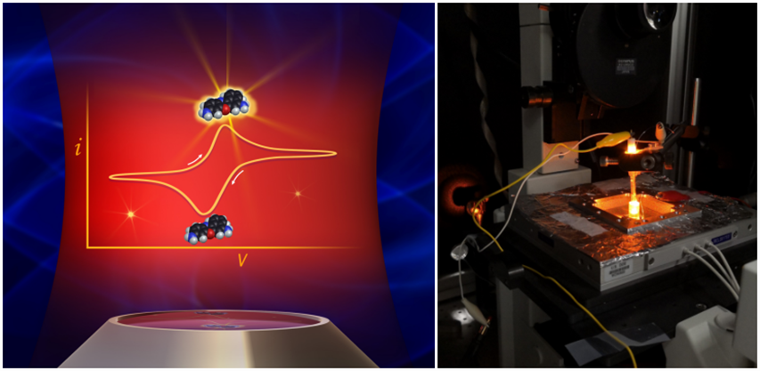超分辨荧光显微镜与电化学循环伏安结合示意图和超分辨荧光显微镜与电化学工作池耦合装置图