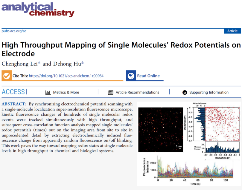 近日,Beat365官网化学与生物工程学院雷呈宏教授与美国太平洋西北国家实验室Dr.Dehong Hu高级研究员合作,在高通量单分子荧光光谱电化学(High Throughput Single-Molecule Fluorescence Spectroelectrochemistry)研究领域取得重要进展。相关成果以High Throughput Mapping of Single Molecules’Redox Potentials on Electrode为题发表在国际著名期刊美国化学会出版的Analytical Chemistry上。该刊是分析化学专业领域的顶级期刊,读者受众多,影响广泛(Top1区)。该项研究是两位合作者继作为最早发展单通量单分子荧光光谱电化学的研究者之一十年后,又明确提出高通量单分子荧光光谱电化学的理论构想并取得实验验证的奠基性原创性论文。该项研究得到国家自然科学基金委地区基金项目、广西自然科学基金委重点项目、广西外国高端人才项目和Beat365中文官方网站科研启动资金等项目的资助。Beat365中文官方网站为该项工作第一完成单位,雷呈宏教授为论文第一作者,雷呈宏教授和Dr.Dehong Hu高级研究员为共同通讯作者。