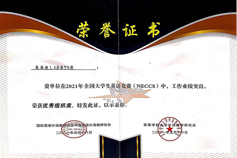 近日,2021年全国大学生英语竞赛(NECCS)广西赛区决赛成绩揭晓。南宁分校学子在比赛中获全国大学生英语竞赛D类特等奖2项、C类一等奖1项和D类一等奖2项,南宁分校获“优秀组织奖”。