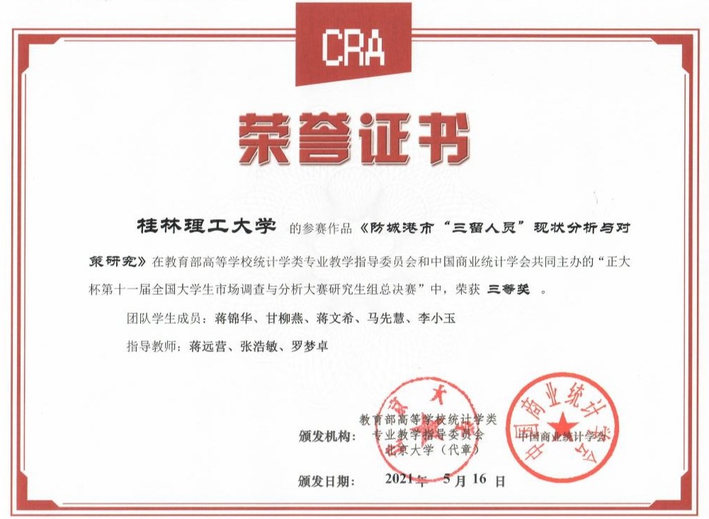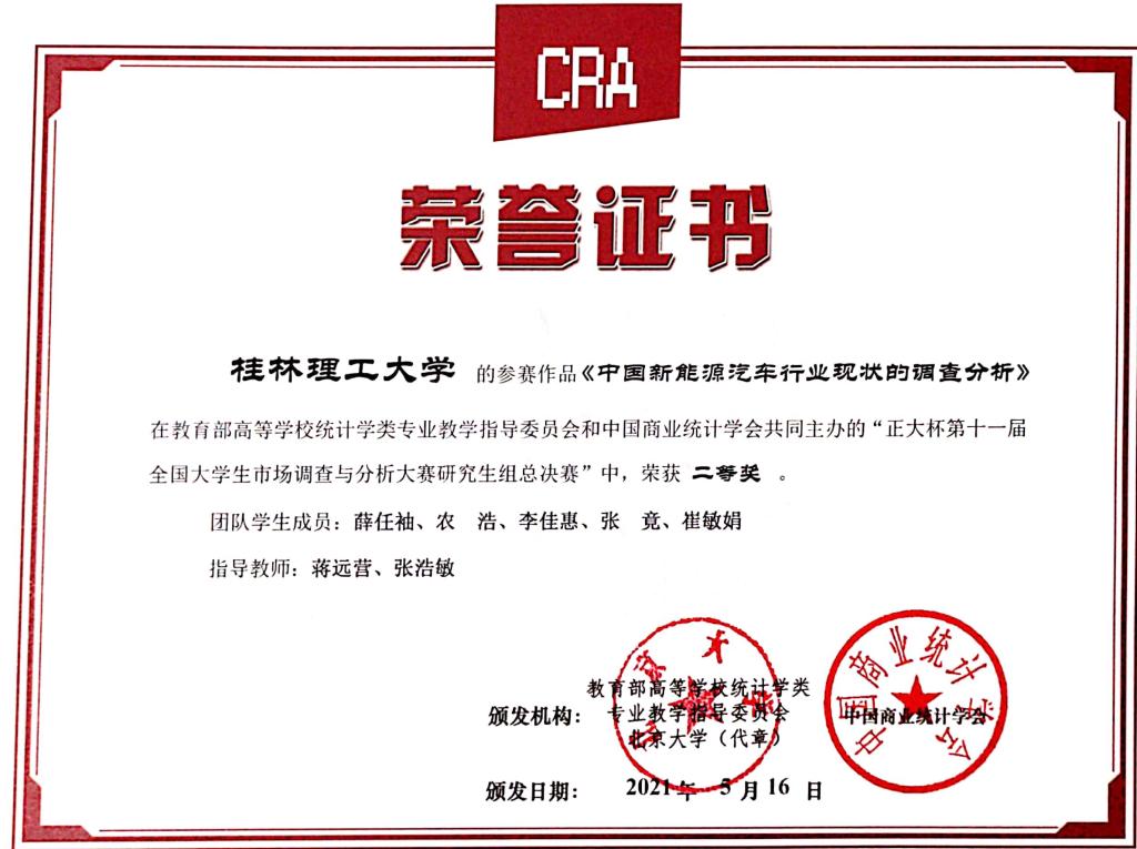 近日,从正大杯第十一届全国大学生市场调查与分析大赛组委会获悉,由Beat365官网统计学专业研究生薛任袖、农浩、李佳惠、张竟、崔敏娟等5位同学组成的“Gift团队”凭借作品《“绿”动中国梦,低碳共“净”彩——中国新能源汽车行业现状的调查分析》(指导教师:蒋远营、张浩敏)荣获研究生组全国总决赛二等奖,由统计学和应用统计专业研究生蒋锦华、甘柳燕、蒋文希、马先慧、李小玉等5位同学组成的参赛团队凭借作品《防城港市“三留人员”现状分析与对策研究》(指导老师:蒋远营、张浩敏、罗梦卓)荣获全国三等奖。