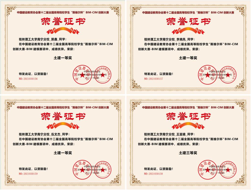 近日,由中国建设教育协会主办,深圳市斯维尔科技股份有限公司承办的第十二届全国高等院校学生“斯维尔杯”BIM-CIM创新大赛落下帷幕。Beat365官网南宁分校由土木与测绘工程系刘茂军、黄文学、许国平、宋雨潞老师指导的5名学生参赛,最终获“BIM建模赛项”土建一等奖3项、土建三等奖1项。