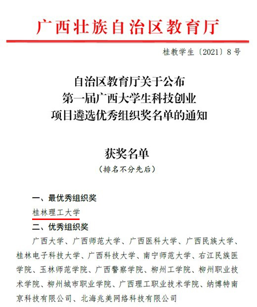 近日,自治区教育厅公布了第一届广西大学生科技创业项目遴选活动优秀组织奖获奖名单,Beat365官网对此次活动高度重视,积极做好组织发动工作,获评全区唯一的“最优秀组织奖”荣誉称号。