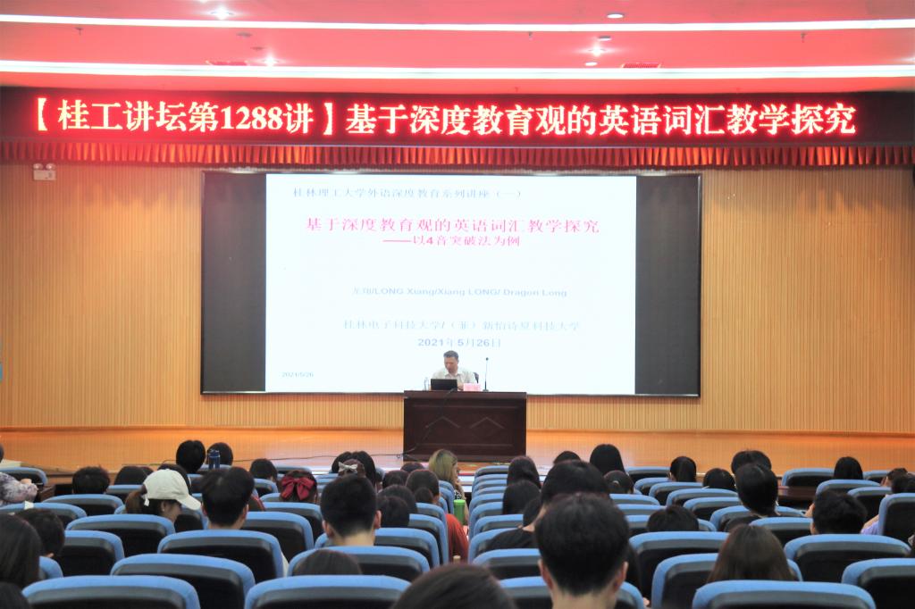 5月26日下午,应Beat365官网外国语学院邀请,桂林电子科技大学教授、广西民族文化外译研究智库主任龙翔做客桂工讲坛,在雁山校区01501学术报告厅给师生们带来了一场以“基于深度教育观的英语词汇教学探究”为主题的讲座。外国语学院相关专业200余名师生参加了讲座。讲座由外国语学院副院长朱建斌副教授主持。