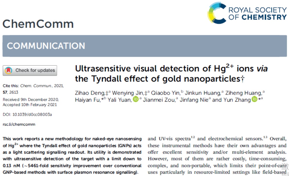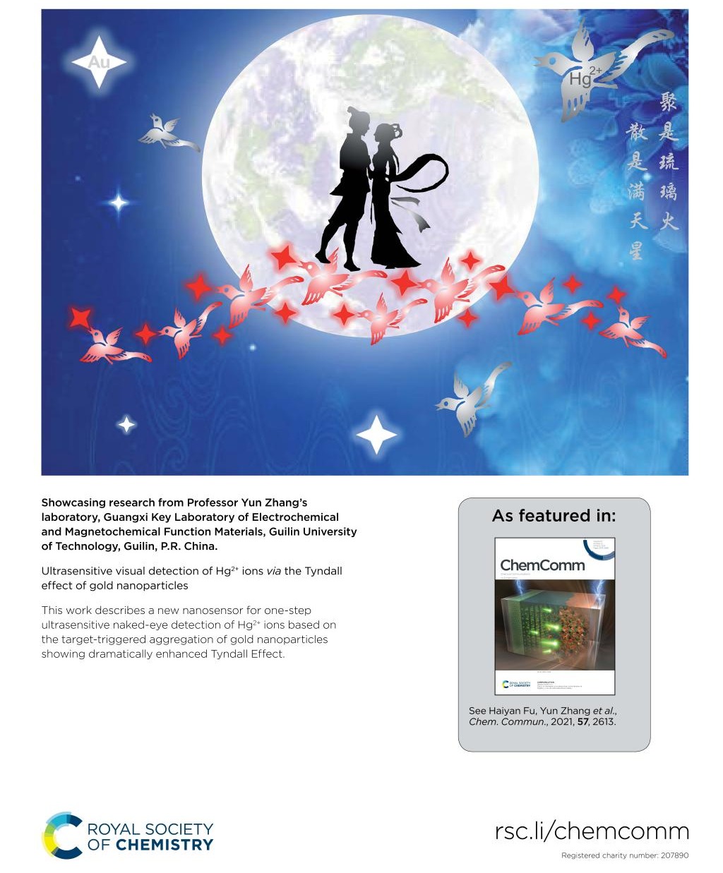 近日,Beat365官网化学与生物工程学院张云教授课题组和中南民族大学付海燕教授课题组合作,在即时检测研究领域取得重要进展。相关成果以Ultrasensitive Visual Detection of Hg2+ ions via the Tyndall Effect of Gold Nanoparticles为题发表在化学领域国际知名期刊Chemical Communication(自然指数收录的82种全球自然科学类顶级期刊之一;影响因子5.996)上,并被选为当期的Outside Back Cover(外封底;以中国古代传说“牛郎织女鹊桥相会”为创意)。该项研究得到国家自然科学基金面上项目、广西杰出青年基金、中央引导地方科技发展资金、广西重点研发计划等项目资助。Beat365官网化学与生物工程学院硕士研究生邓子豪和讲师金文英为论文共同第一作者,Beat365中文官方网站为第一通讯单位。