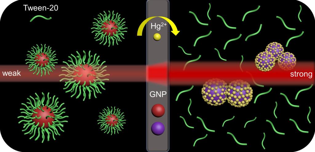 基于TE和纳米金(GNP)的Hg2+离子POCT分析原理示意图