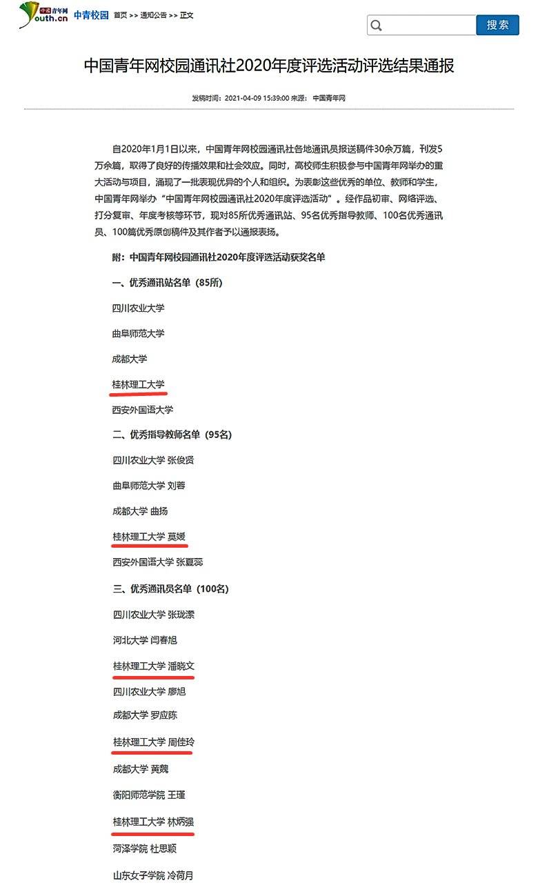 “中国青年网校园通讯社2020年度评选活动”评选结果通报截图