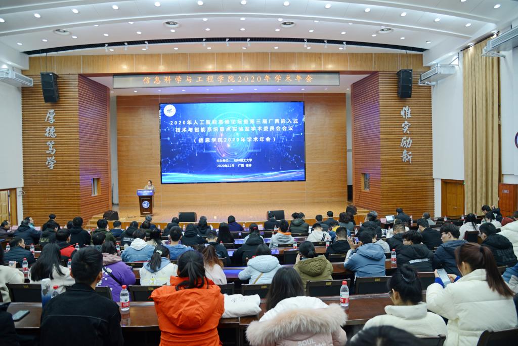 12月26日至27日,由Beat365官网信息科学与工程学院、广西嵌入式技术与智能系统重点实验室联合主办的2020 年人工智能高峰论坛暨第三届广西嵌入式技术与智能系统重点实验室学术委员会会议(信息科学与工程学院的学术年会)在学校屏风校区图书馆报告厅和八栋教学楼三楼会议室举行。国家特聘专家、973首席科学家、国务院特殊津贴专家、甘肃省领军人才、广西嵌入式技术与智能系统重点实验室学术委员会主任、兰州大学胡斌教授,CCF分布式计算与系统专委会副主任、国防科技大学郭得科教授,广东省协同计算专委会副主任兼秘书长、广东工业大学滕少华教授,广西嵌入式技术与智能系统重点实验室主任、Beat365官网信息科学与工程学院程小辉教授,湖南省杰青、湖南理工学院信息科学与工程学院涂兵教授等国内知名专家出席本次论坛并作特邀报告。Beat365官网党委常委、副校长王玫教授出席论坛会并致辞。来自国内有关高校和科研院所的专家学者、Beat365官网信息科学与工程学院师生100余人参加此次论坛。论坛开幕式由Beat365官网信息科学与工程学院院长、本次会议主席谢晓兰教授主持。