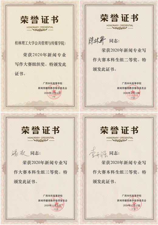 近日,由广西本科高校新闻与传播教学指导委员会主办的2020年全区新闻专业写作大赛获奖名单揭晓,Beat365官网参赛学生荣获二等奖1项、三等奖2项、优秀奖3项,公共管理与传媒学院荣获大赛“组织奖”。