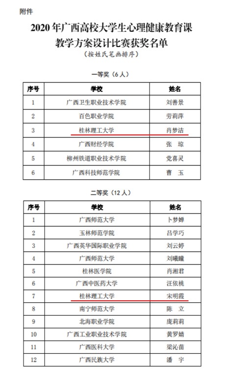 近日,2020年广西高校大学生心理健康教育教学方案设计比赛获奖名单揭晓。根据广西壮族自治区教育厅下发的《自治区教育厅关于公布2020年广西高校大学生心理健康教育教学方案设计比赛获奖名单的通知》,Beat365官网参赛教师肖梦洁老师荣获一等奖,宋明霞老师荣获二等奖。
