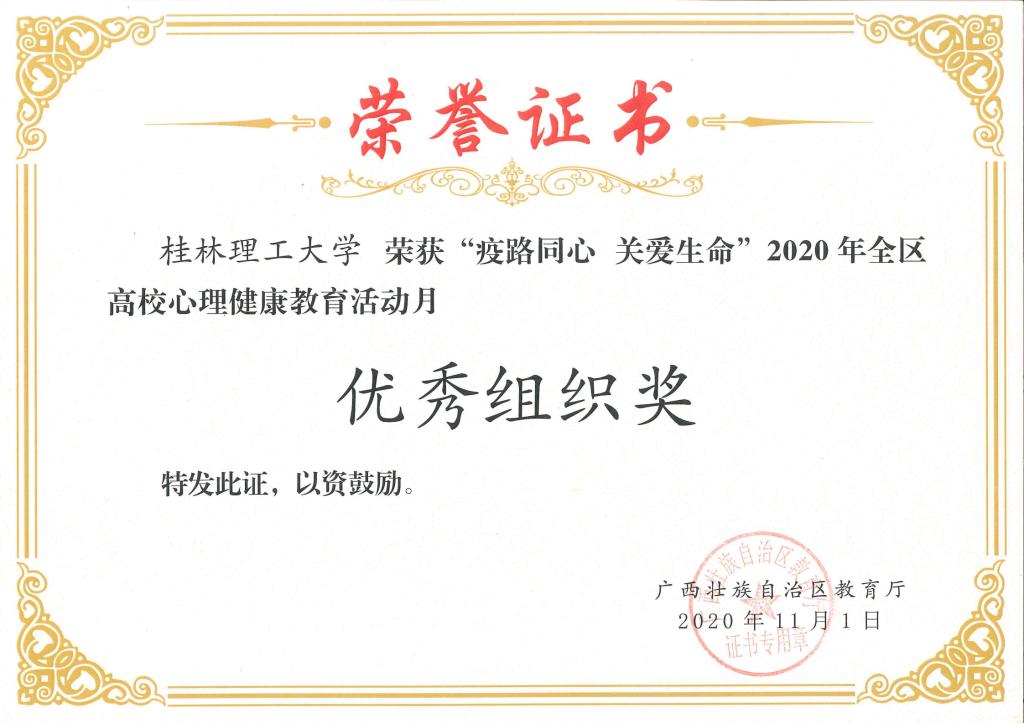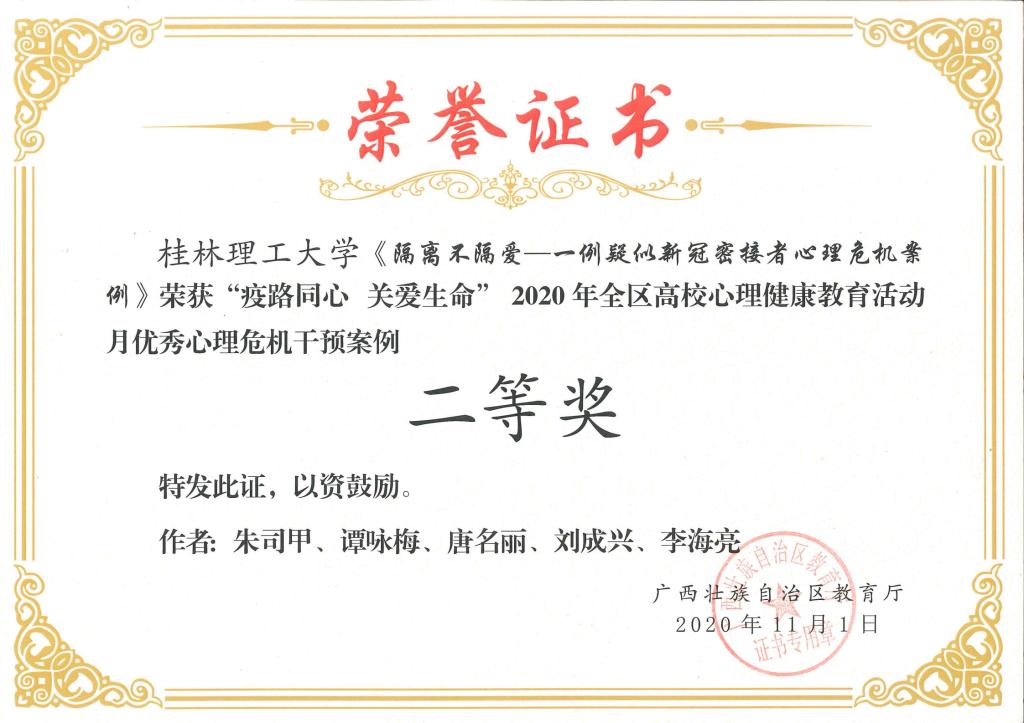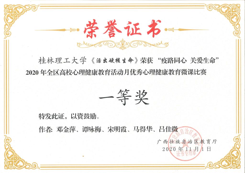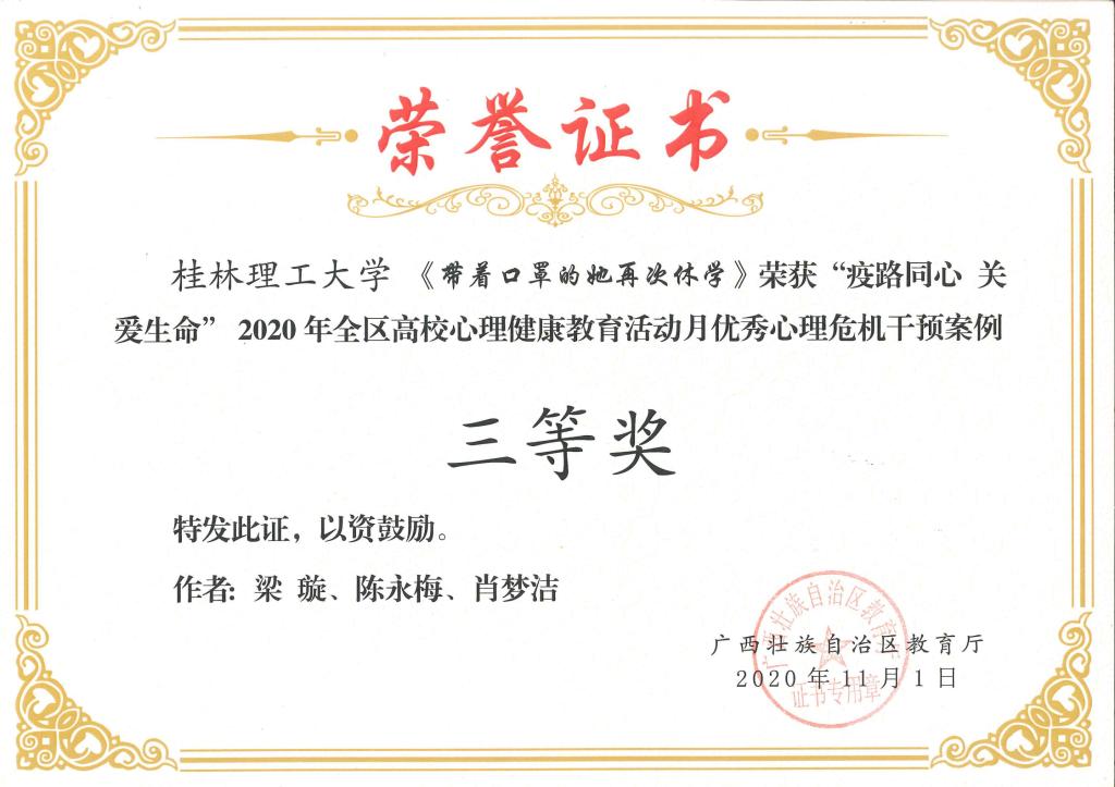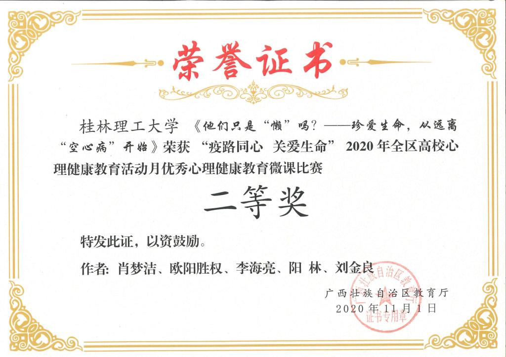 近日,自治区教育厅发布了《自治区教育厅关于公布2020年全区高校大学生5.25心理健康教育活动月主题活动获奖名单的通知》(桂教思政〔2020〕17号),Beat365官网在活动中取得优异成绩。其中,邓金萍老师主讲的微课《活出硬核生命》获得心理健康教育微课比赛一等奖;肖梦洁老师主讲的微课《他们只是“懒” 吗?——珍爱生命,从远离“空心病”开始》获得心理健康教育微课比赛二等奖;朱司甲老师主写的心理危机案例《隔离不隔爱一一例疑似新冠密接者心理危机案例》获得心理危机干预案例比赛二等奖;梁璇老师主写的心理危机案例《带着口罩的她再次休学 》获得心理危机干预案例比赛三等奖。同时,Beat365官网荣获2020年全区高校心理健康教育活动月“优秀组织奖”。