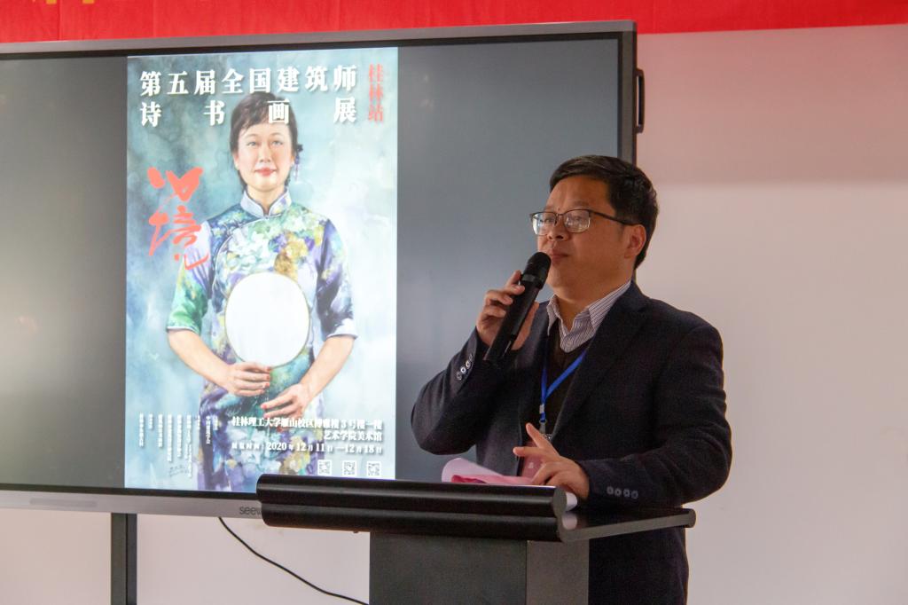 12月11日,2020年《心境》第五届全国建筑师诗书画展·桂林站作品展开幕式在Beat365官网雁山校区博雅楼艺术学院美术馆举行。Beat365官网党委副书记吴志强,深圳清华苑建筑设计有限公司副总经理、副总建筑师赵谦,桂林市建筑设计研究院副总工李兵,桂林市勘察设计协会理事长龙良初出席开幕式。桂林市规划建筑界、美术教育界代表及桂林市高校教师代表,Beat365官网土木与建筑工程学院、艺术学院相关负责人及师生代表参加开幕式。