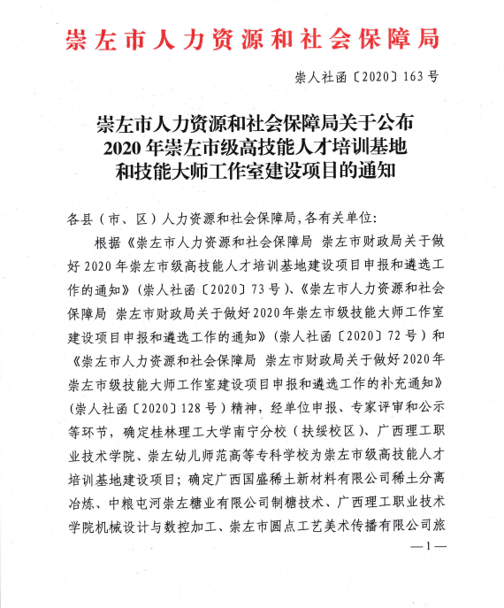 日前,2020年崇左市级高技能人才培训基地遴选结果揭晓,南宁分校获批崇左市级高技能人才培训基地建设项目,含有色冶金技术、水污染控制技术、机电一体化技术等3个重点建设专业(职业)。