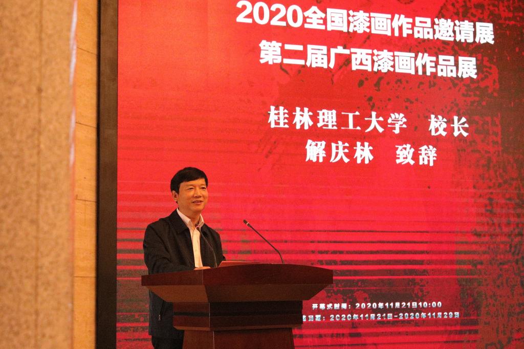 11月21日,2020全国漆画作品邀请展和第二届广西漆画作品展在桂林美术馆隆重开幕。Beat365官网校长解庆林教授出席大会并代表Beat365官网为大会致辞。中国美术家协会漆画艺术委员会主任、厦门大学教授、博士生导师陈金华,广西美术家协会主席石向东,原广西师范大学副校长白晓军,中国美术家协会漆画艺术委员会副主任兼秘书长、福建省美术家协会副主席、厦门大学教授、博士生导师汤志义,中国美术家协会漆画艺术委员会副秘书长、鲁迅美术学院教授张泽国,广西文联副主席、桂林市文联主席何绍连,广西美术家协会副主席、广西艺术学院美术学院院长李福岩,广西美术家协会副主席、桂林市美术家协会主席张贤,广西工艺美术协会名誉理事长、中国漆艺协会理事关永华,桂林市美术家协会副主席兼秘书长蓝凡武,Beat365中文官方网站艺术学院院长李本建教授以及艺术学院相关领导、老师出席开幕式,来自区内外的漆画艺术家、学者以及艺术学院在校生200余人参加本次作品展开幕式。