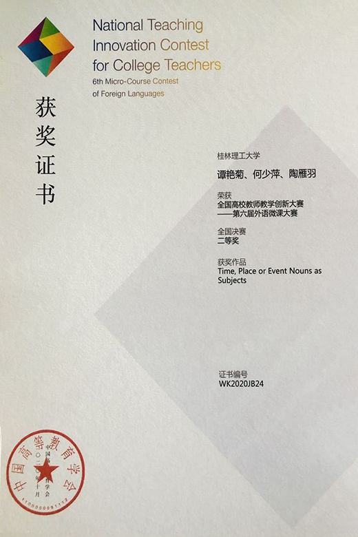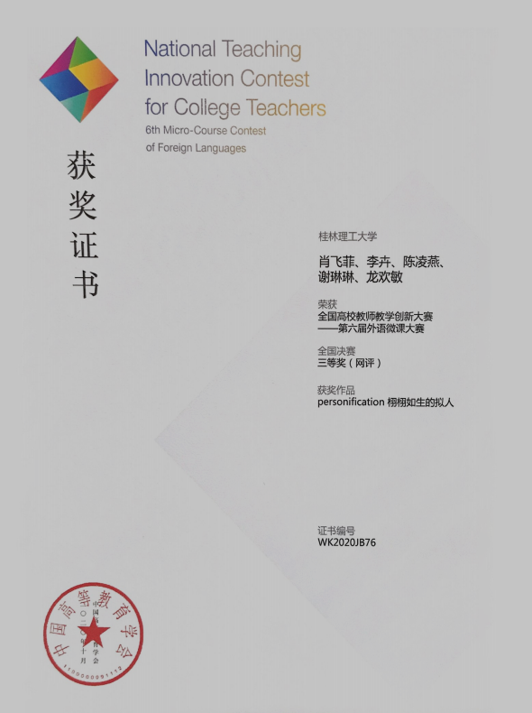 11月10日,由中国高等教育学会主办的全国高校教师教学创新大赛——第六届外语微课大赛颁奖仪式暨微课设计与应用研讨会在长沙举行。此届外语微课大赛历时6个月,通过网络初赛、各省现场复赛和全国线上决赛等环节,从全国2590件(其中本科1335件)微课作品中评选出81件(其中本科44件)获奖作品。Beat365官网外国语学院谭艳菊、何少萍、陶雁羽等三位老师团队的微课作品《Time, Place or Event Nouns as subjects》,肖飞菲、李卉、陈凌燕、谢琳琳、龙欢敏等五位老师团队的微课作品《Personification 栩栩如生的拟人》从众多作品中脱颖而出,分别荣获全国决赛二等奖和三等奖。