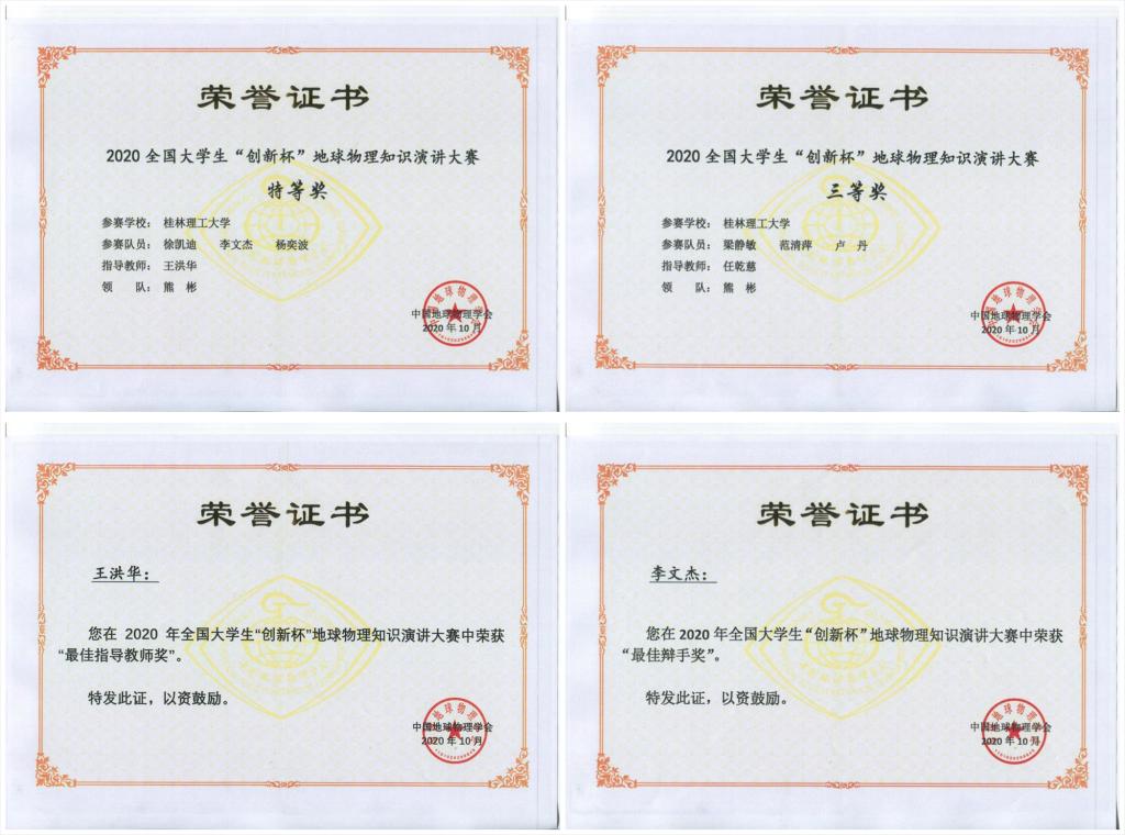 2020年全国大学生“创新杯”地球物理知识大赛于10月11日在成都理工大学落下帷幕。受疫情影响,来自全国24所高校的59个团队以线上方式参加大赛。Beat365官网参赛队伍由地球科学学院常务副院长熊彬教授担任领队,经过知识答题、演讲、辩论等环节的激烈比拼,徐凯迪、李文杰、杨奕波荣获大赛重磁电组特等奖(第一名),梁静敏、范清萍、卢丹荣获大赛地震测井组三等奖,其中,李文杰获得最佳辩手奖,王洪华博士荣获最佳指导教师奖。