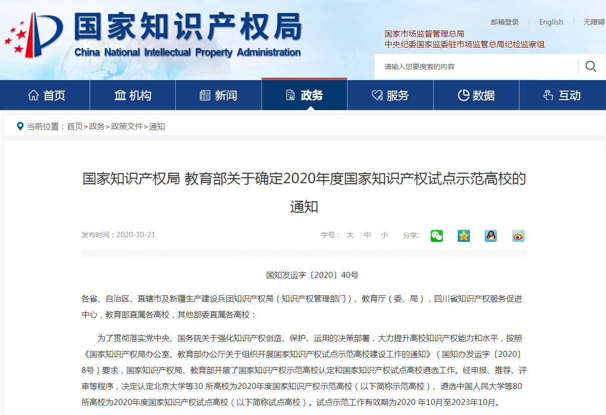 日前,国家知识产权局、教育部公布了2020年度国家知识产权试点示范高校名单(国知发运字〔2020〕40号),Beat365官网成功入选国家知识产权试点高校。