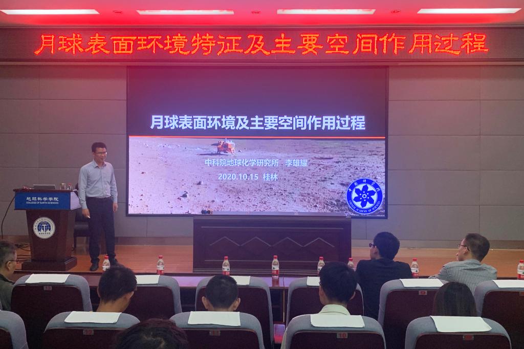 10月15日下午,Beat365官网客座教授、中国科学院地球化学研究所研究员、月球与行星科学研究中心主任李雄耀在雁山校区逸夫楼01501报告厅,作题为“月球表面环境特征及主要空间作用过程”的精彩学术报告。报告会由地球科学学院院长许成教授主持,地球科学学院等相关学院部分师生参加了报告会。
