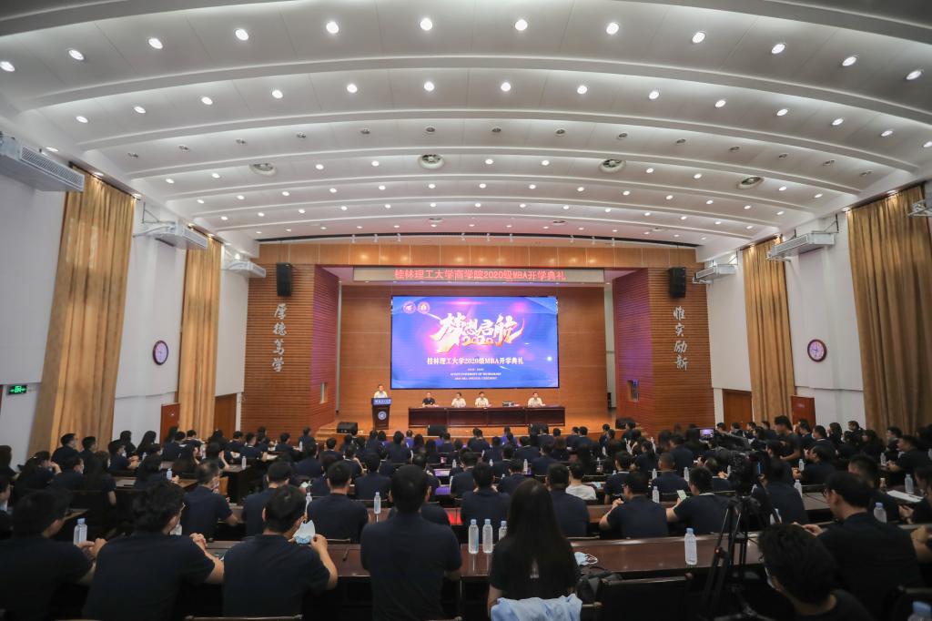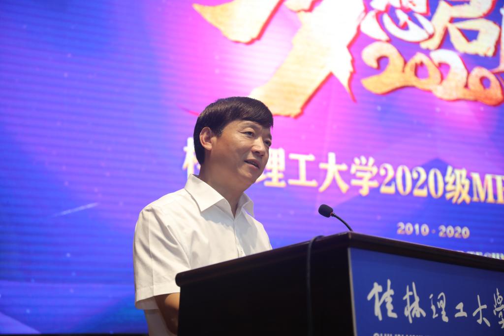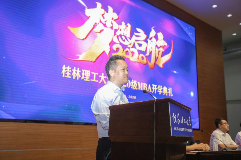 解庆林首先向2020级MBA新生表示衷心祝贺和热烈欢迎,并介绍了学校的历史渊源、发展现状以及近年来在教学科研、人才培育、社会服务等方面取得的优秀成果。解庆林向2020级MBA全体同学提出两点希望:一是在学习生活上要勤努力、学知识,把个人发展与国家社会发展相结合;二是在商业活动中要守底线、敢担当,全面践行“厚德笃学,惟实励新”的校训,在新时代浪潮中,与桂工共同奋进,实现自己的人生价值。