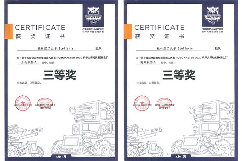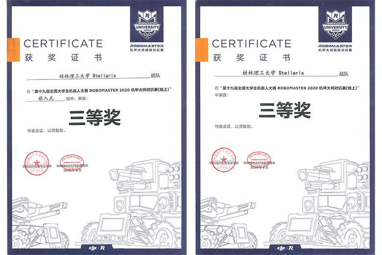 步兵机器人组、英雄机器人组、嵌入式组三等奖及团体三等奖获奖证书