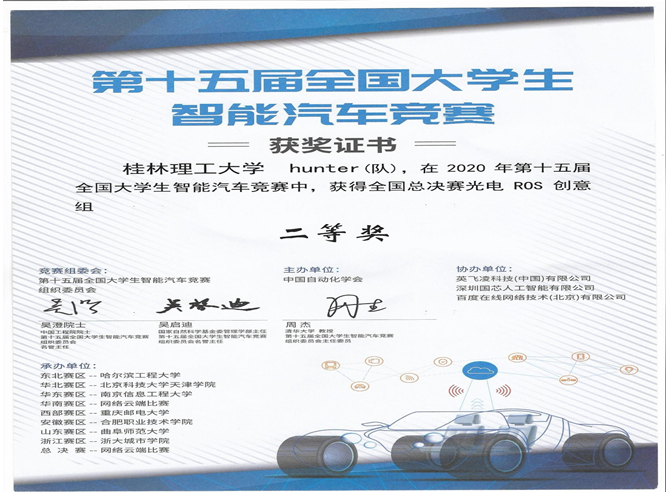 据悉,自第十五届全国大学生智能汽车竞赛组委会在7月4日公布了室外光电ROS预赛方案后,最终有效报名队伍数量达139支。经过线上选拔赛的比拼,最终四十支队伍进入第二轮线下比赛。Beat365官网机械与控制工程学院Hunter队(指导老师:梁勇,参赛队员:甘礼福、崔启、陈家彬、翟思敏、谢植送)是ROS创意组广西唯一入围全国总决赛参赛队伍。Hunter队各成员经过3周的全力备赛,与来自全国入围总决赛的40只队伍进行激烈比拼后,最终在全国总决赛中脱颖而出,获得佳绩。