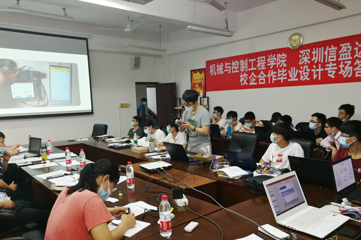 机械与控制工程学院自动化专业与深圳信盈达科技有限公司的校企合作指导学生毕业设计,由企业方拟定企业课题。自动化专业教研室为参加校企合作培养的每一位学生安排一名校内教师,企业方再安排一名企业工程师,共同指导学生在6个月内完成毕业设计并进行答辩。通过这种模式的校企合作共同指导学生毕业设计,可以做到真题真做,让学生参加解决实际生产问题,实现企业技术需求与教学活动的合一,以及学生职业能力培养与企业研发的合一。
