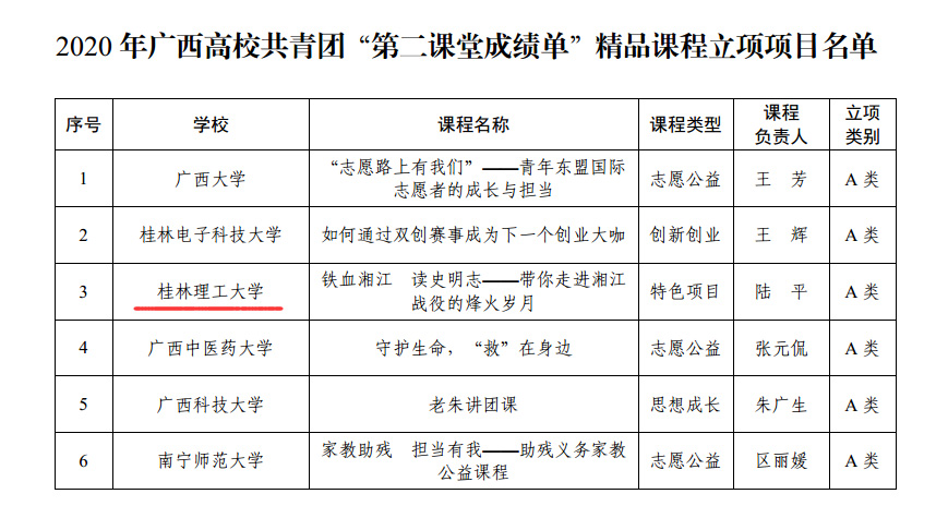 据悉,全区共30 门课程入选2020 年广西高校共青团“第二课堂成绩单”精品课程立项项目,其中A 类课程10门、B类课程20门。