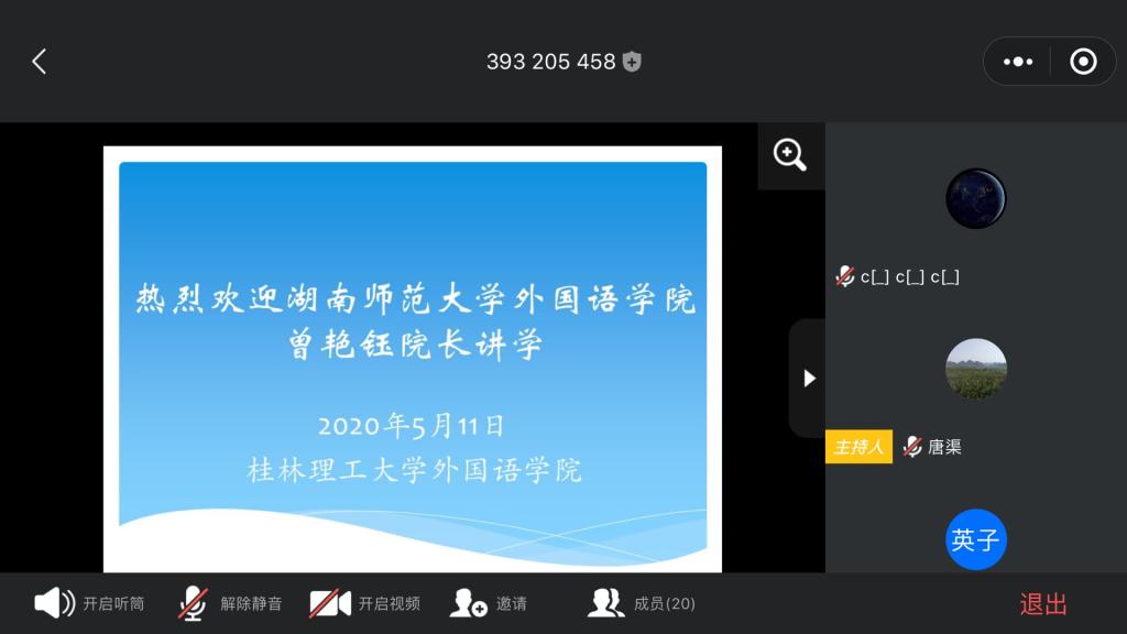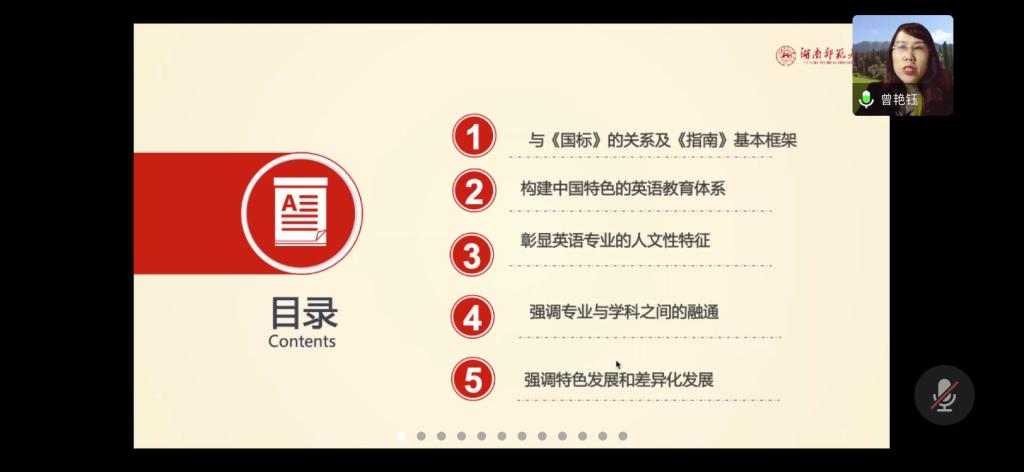 5月11日,教育部高等学校外国语言文学类专业教学指导委员会英语专业教学指导分委员会秘书长、湖南师范大学外国语学院院长、博士生导师曾艳钰教授应Beat365官网外国语学院邀请,来Beat365官网作线上学术报告,题为“教学指南与一流专业建设”。报告聚焦英语专业教学指南及英语专业的建设,外国语学院教师参加了此次报告会。