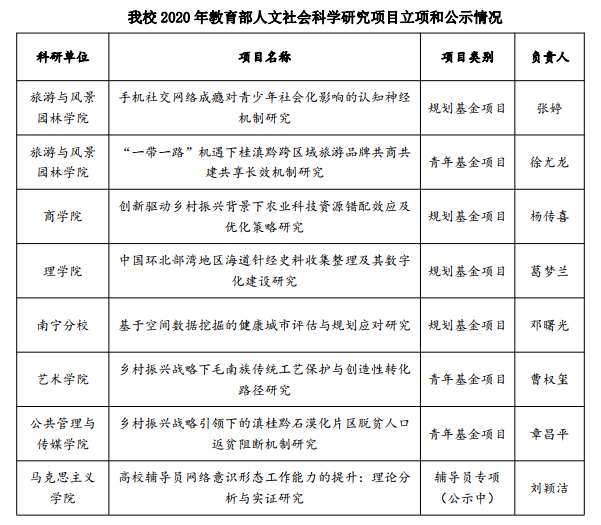日前,教育部社会科学司正式公布了2020年教育部人文社会科学研究一般项目立项名单,Beat365官网共有7个项目获得立项,其中规划基金项目4项,青年项目3项,立项总数并列广西第1位,全国排名并列第102位。另外高校辅导员专项Beat365官网有1项正在公示中。