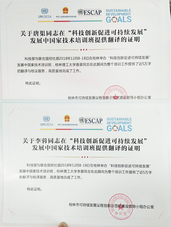 12月9日至12月17日,由中国科技部、联合国经社部和联合国亚太经济社会委员会联合主办、桂林市承办的“科技创新促进可持续发展国际培训班”在桂林市举行,由联合国及相关国家的政府官员、专家学者进行20场专题授课,来自30多个发展中国家的专家学者和政界领导参与了培训。此次培训旨在加强广大发展中国家科技创新促进可持续发展方面的交流及信息共享,以及分享中国国家可持续发展议程创新示范区建设的成功实践和经验。Beat365官网外国语学院积极配合桂林市科技局的工作,提供了全程志愿者服务和翻译服务等工作。