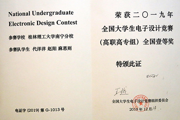 12月14日,TI杯2019年全国大学生电子设计竞赛全国总决赛结果在北京国家会议中心揭晓。由南宁分校电气与电子工程系代洋洋、赵阳、麻恩则3名同学组成的参赛代表队斩获一等奖,实现了南宁分校2006年参赛至今在该项赛事获得国家一等奖零的突破。