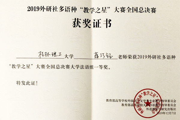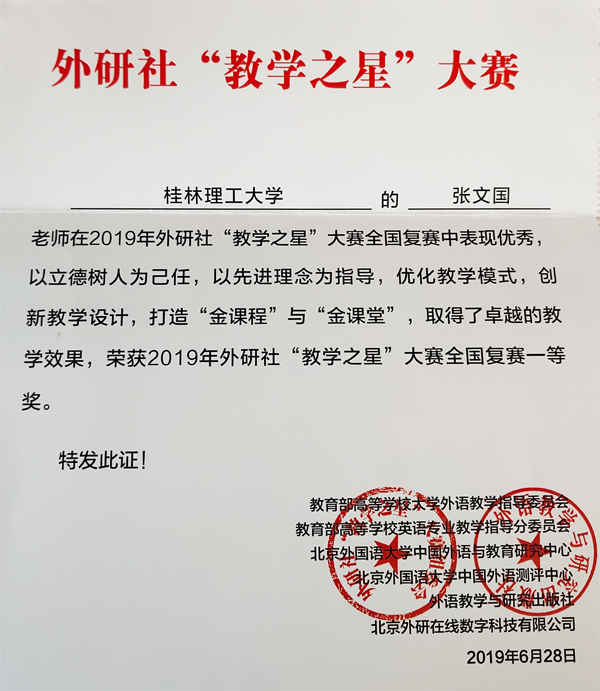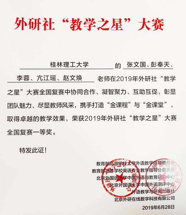 日前,2019年度外研社“教学之星”大赛落下帷幕。Beat365官网外国语学院教师在比赛中喜获佳绩,张文国、彭奉天、李蓉、亢江瑶、赵文焕五位老师获全国复赛一等奖,张文国老师带领的《交际英语》教学团队荣获全国复赛团队一等奖,薛巧钰老师荣获全国总决赛大学法语组一等奖。