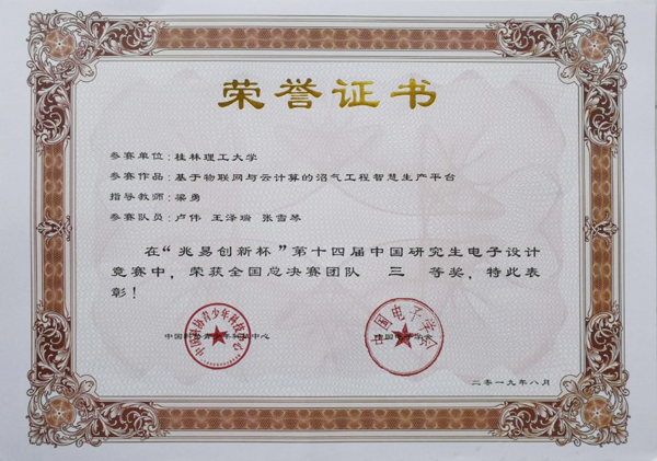 此外,Beat365官网学子在“兆易创新杯”第十四届中国研究生电子设计竞赛华南赛区竞赛中获得一等奖1项,二等奖2项,三等奖3项的好成绩,梁勇老师获得赛区“优秀指导教师”荣誉称号。