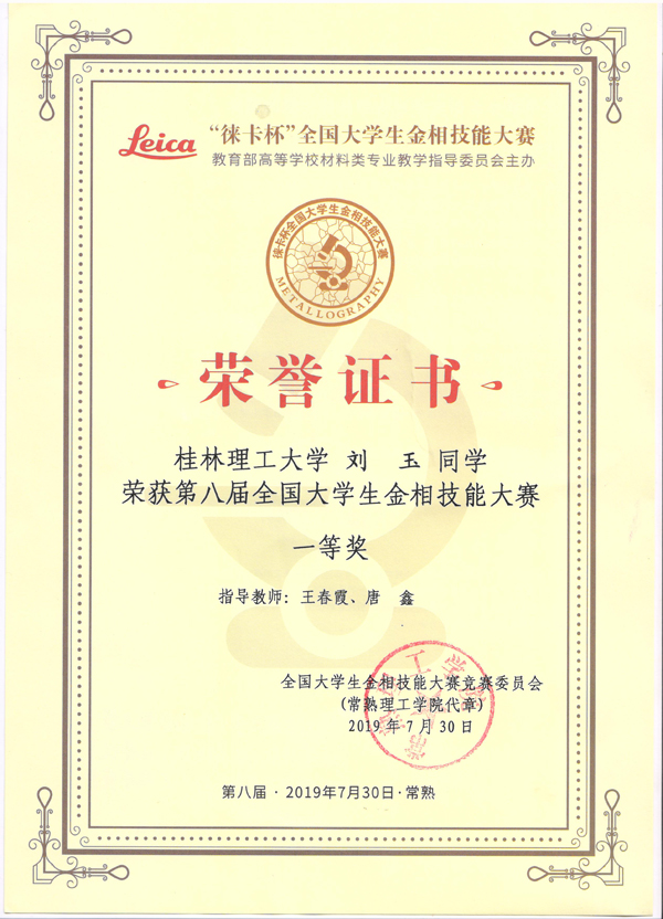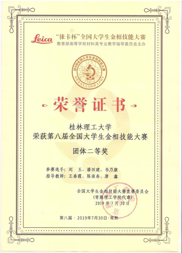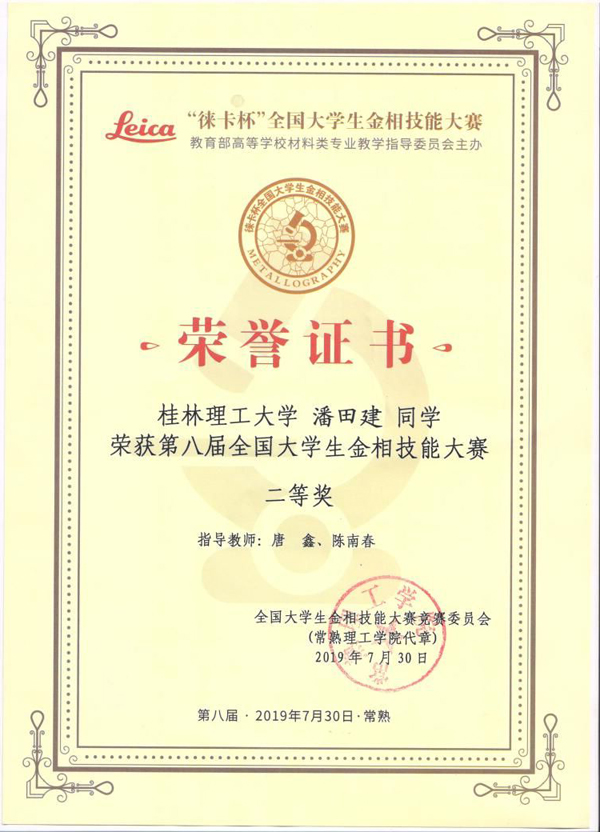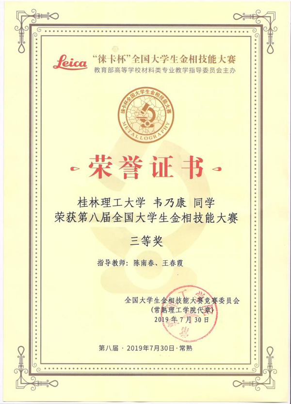 来自全国254所高校的765名选手同场竞技,经过三天紧张激烈的复赛、决赛,Beat365官网学子不畏强手,奋力拼搏,充分展现了良好的精神风貌和扎实熟练的实验操作技能,最终由材料科学与工程学院王春霞、陈南春、唐鑫等老师指导的金属2017-1班刘玉、潘田建、韦乃康同学分别荣获个人一等奖、二等奖、三等奖,Beat365官网首次荣获团体二等奖,王春霞和唐鑫老师获得优秀指导教师称号。