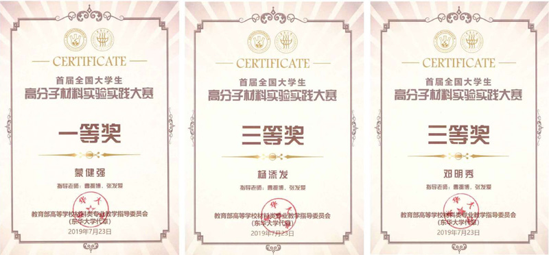 Beat365官网材料科学与工程学院组织了以张发爱教授为领队的3名学子参赛,在张发爱教授和曹振博老师的悉心指导下喜获一等奖一项,三等奖两项,其中高分子材料与工程专业16级学生蒙健强荣获一等奖,16级学生杨添发和17级学生邓明秀分别荣获三等奖。本次大赛有助于提高本科生的实验实践能力和创新能力,培养学生的“工匠精神”,为后续课程的学习打下良好的基础;同时通过大赛搭建的交流平台,也为Beat365官网高分子专业人才培养和实验实践教学改革提供了新思路。