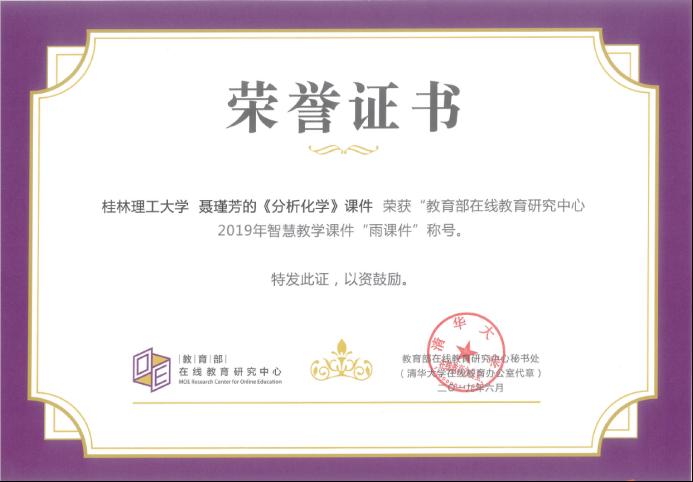 在近期举行的2019年度教育部在线教育研究中心智慧教学电子教材“雨课件”评选中(相关链接:http://www.rcoe.edu.cn/?p=4037),Beat365官网聂瑾芳老师教学团队完成的《分析化学》智慧教学课件荣获“2019智慧教学课件‘雨课件’”。此次评选全国仅有11门课程课件获得该荣誉,Beat365官网聂瑾芳老师的《分析化学》“雨课件”,是今年广西高校唯一入选的课程课件。